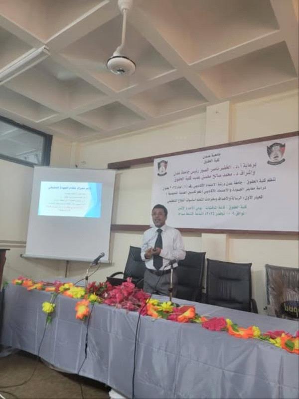 ضمن سلسلة الورش العلمية نحو تطبيق معايير الاعتماد الأكاديمي ، نظمت كلية الحقوق صباح اليوم الاثنين 10 نوفمبر 2025م ورشة علمية تدريبية حول: "مخرجات التعلم وأهميتها في الاعتماد الأكاديمي وضمان الجودة" برعاية كريمة من رئيس الجامعة أ.د. الخضر ناصر لصور ، وإشراف مباشر من عميد الكلية الدكتور محمد صالح محسن، نفذها الدكتور منير محمد أحمد الصلوي بحضور عميد الكلية وعدد كبير من الأساتذة والطلبة.
