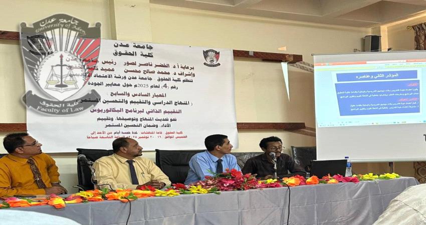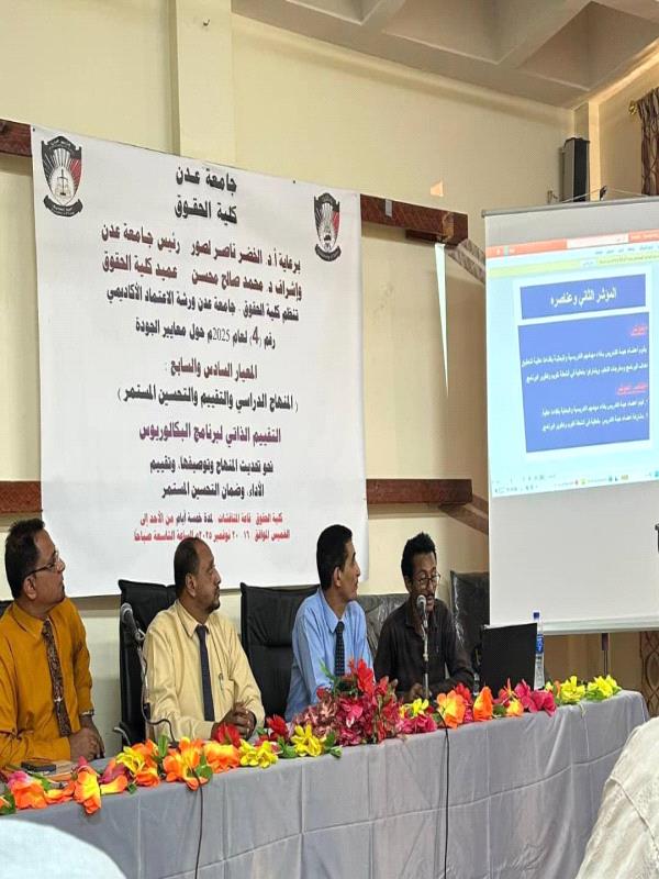 ضمن سلسلة الورش العلمية نحو تطبيق معايير الاعتماد الأكاديمي ، نظمت كلية الحقوق صباح اليوم الأحد 16 نوفمبر 2025م ورشة علمية تدريبية حول: " المنهج الدراسي وهيئة التدريس كمعيارين للاعتماد الأكاديمي وضمان الجودة" برعاية كريمة من رئيس الجامعة