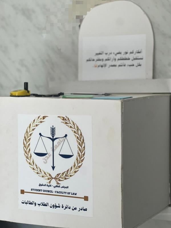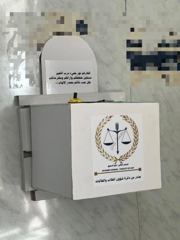 في ظل جهود عمادة كلية الحقوق والمجلس الطلابي لتعزيز قنوات التواصل المباشر مع طلاب الكلية، وبرعاية عميد الكلية أ.مشارك د. محمد صالح محسن، وبإشراف المجلس الطلابي، قامت دائرة شؤون الطلاب والطالبات يوم الخميس الموافق 11 ديسمبر 2025م بتنفيذ مبادرة إطلاق صندوق الملاحظات والاقتراحات داخل مبنى الكلية.